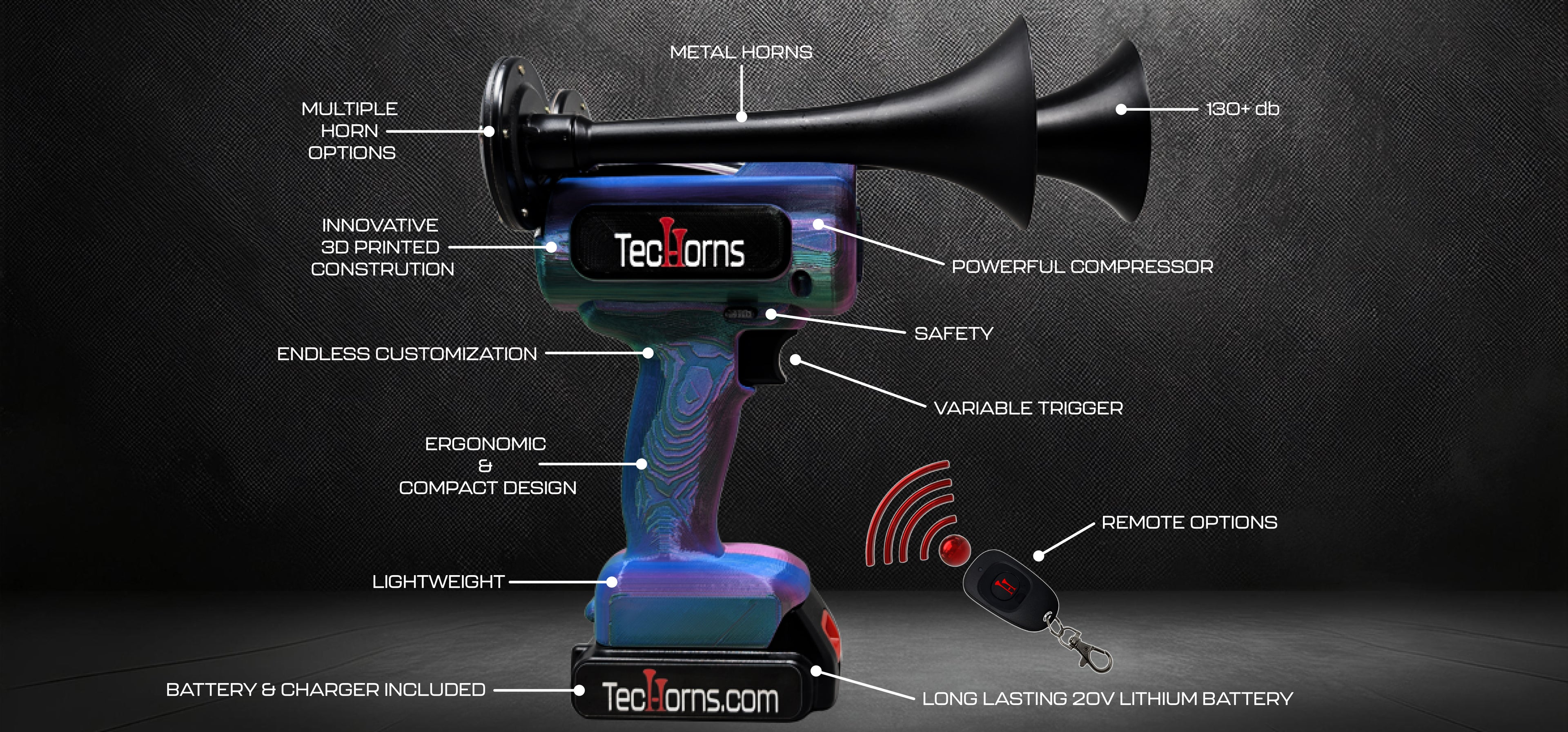 Custom Dual Color TecHorn 4-Horn – 130 dB Compact Train Horn with 2-Tone Custom Style + Battery